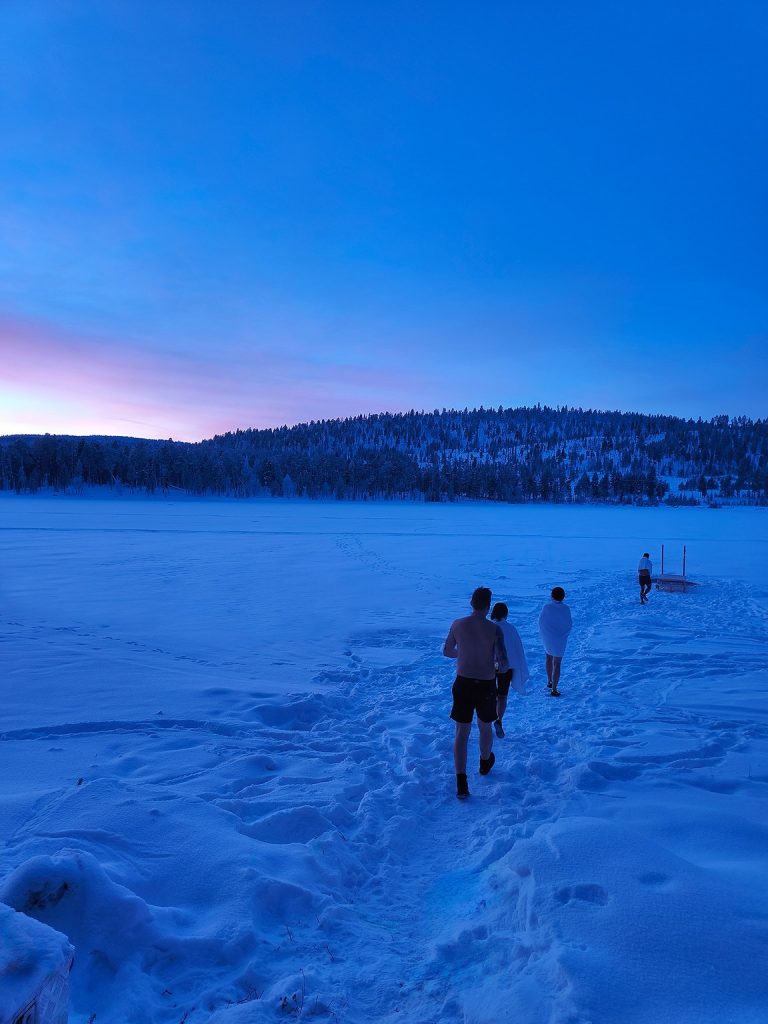 Un doux mélange d’adrénaline et de quiétude : vitesse en motoneige, silence à traquer les traces dans la neige, chaleur du sauna après un bain glacée….. et avec un peu de chance, un ciel arctique illuminé par une aurore boréale.
