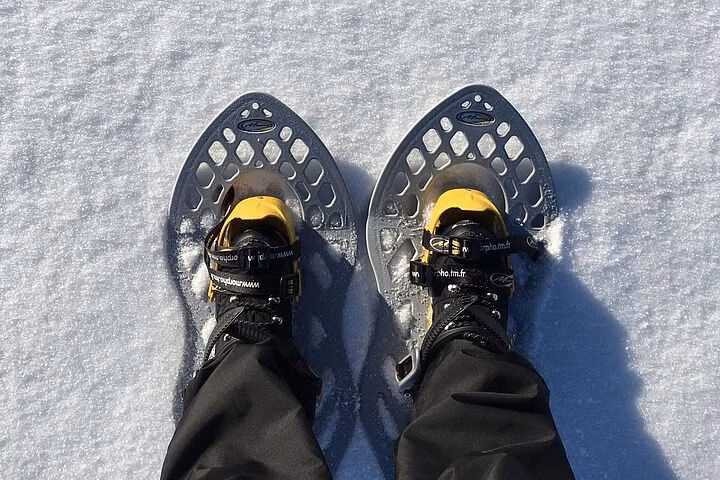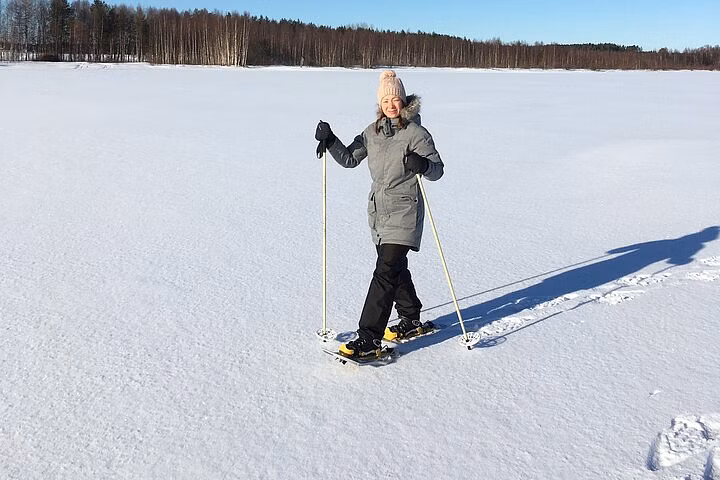 Selon les conditions de neige, nous randonnons soit avec des raquettes, soit avec des « raquettes glissantes » finlandaises modernes (courtes et larges, partiellement basées sur des peaux).