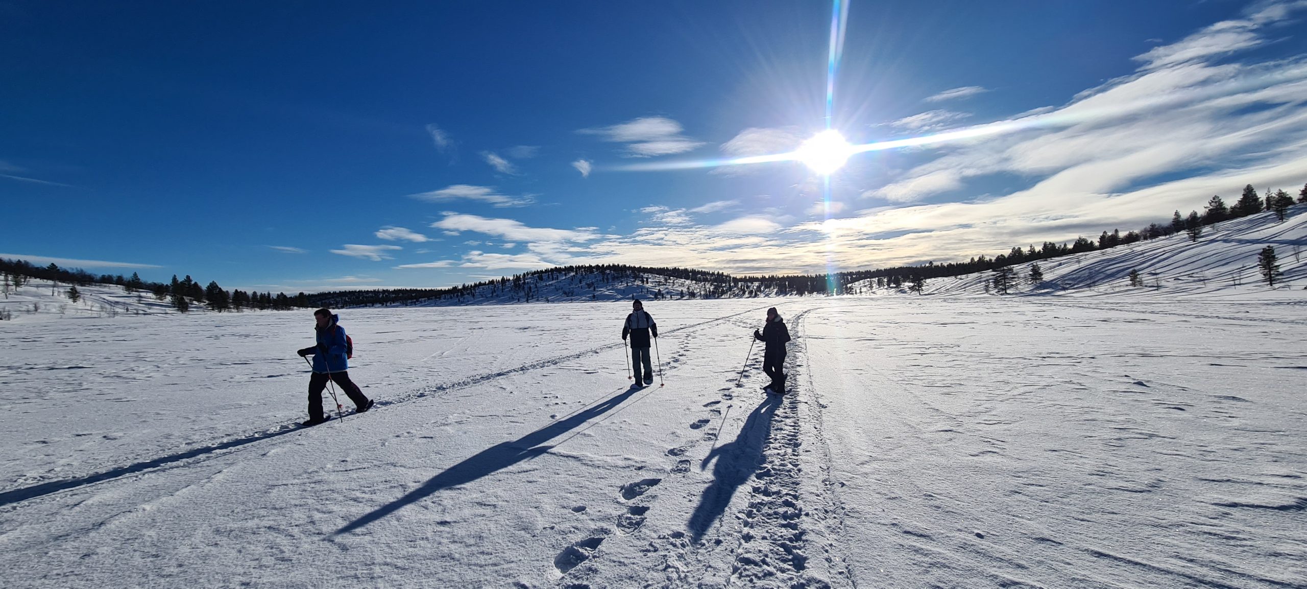 Selon les conditions de neige, nous randonnons soit avec des raquettes, soit avec des « raquettes glissantes » finlandaises modernes (courtes et larges, partiellement basées sur des peaux).
