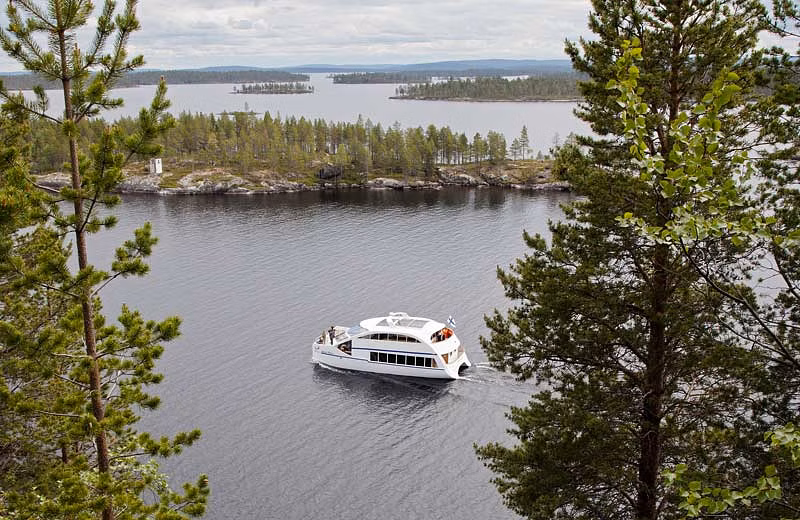 Nous nous rendrons au port où nous embarquerons sur un catamaran hybride électrique pour une croisière sur le lac Inari. La croisière sur le lac Inari est un moyen facile de découvrir le plus grand lac arctique sauvage de Laponie du Nord.